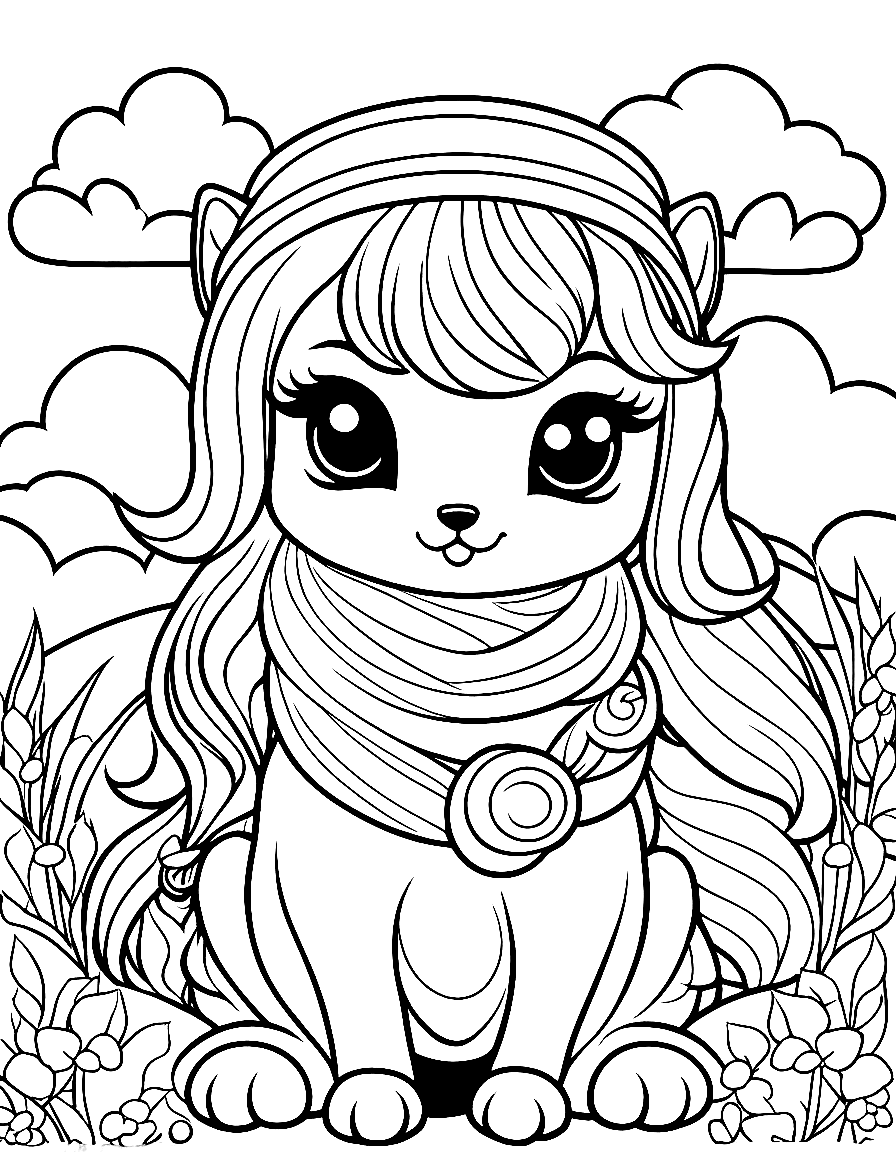 Cute cartoon witch girl holding a magic staff, standing with a jack-o’-lantern and a pumpkin — Halloween coloring page.